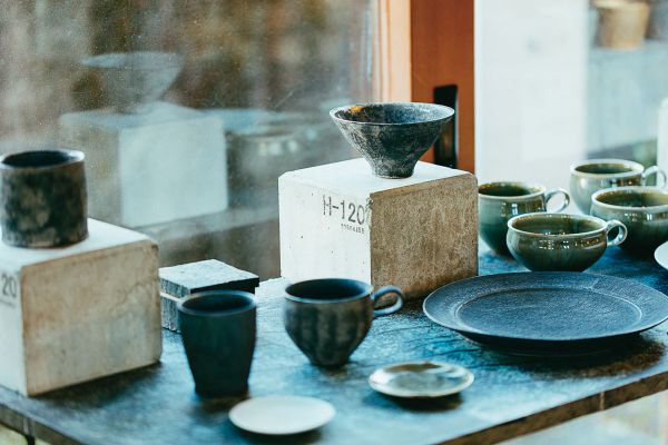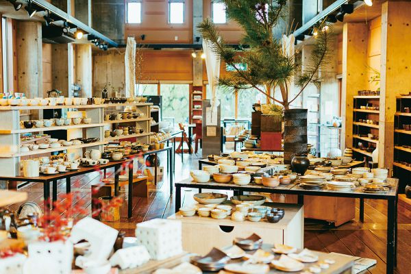 「丸尾焼」の窯元に併設されたギャラリーは、器のセレクトショップのような品揃え。その多彩ぶりに、さぞや多くの作家たちがそれぞれの個性を生かした作陶を行っているのかと思いきや、分業制が基本だそう。土づくりからろくろ、仕上げの成形、釉薬に絵付け、さらには販売まで、器作りにまつわる多くの工程を分業することで作品のクオリティが高まり、同時に若手陶芸家の育成にもつながるのだといいます。
