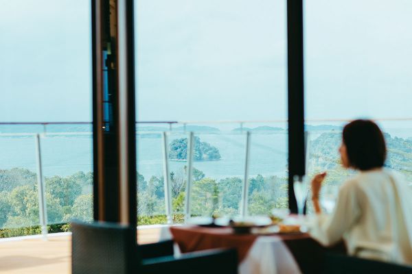 大小20あまりの島が浮かぶ天草・松島。白い砂岩と松がおだやかな海を彩るさまは、日本三大松島のひとつに数えられています。橋を渡りながら見る風景も美しいのですが、せっかくなら普段のドライブルートでは見ることのできない美景を楽しみたいものです。小高い丘からせり出す「天草 天空の船」は全館オーシャンビューのリゾートホテル。約5000坪の敷地にはその名の通り〝天空に浮かぶ船〟をイメージした本館や、3棟の離れが点在し、極上のくつろぎを演出してくれます。