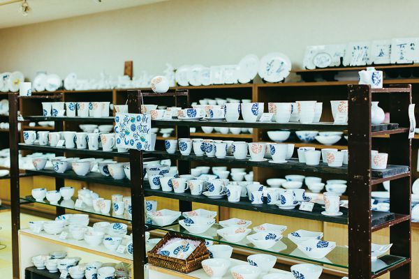 少し足を伸ばして天草下島へ。「高浜焼 寿芳窯」のギャラリーには、透明感のある白磁の器が並んでいます。中でも目を引くのが、さきほどレストランで出会った「海松紋」です。江戸時代中期に焼かれた古高浜焼の文様を復刻したもので、深めの小鉢やマグカップ、オーバル皿やフリーボウルなど、現代の食卓にコーディネートしやすいラインナップも人気の理由です。