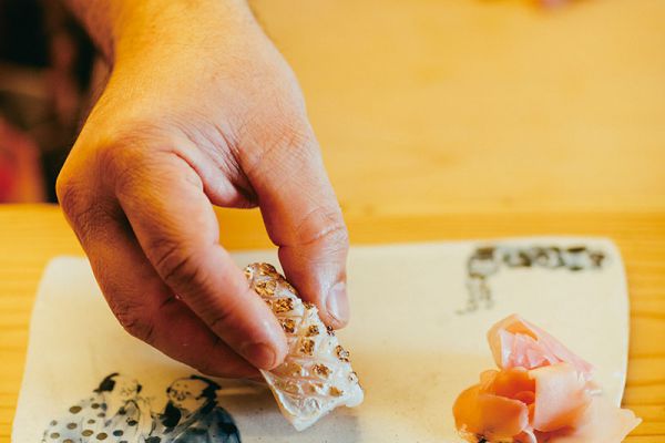 﨑津集落のなかにある寿司店「海月(くらげ)」の大将・宮下剛さんも、十朗窯の器を味方につけるひとりです。海を眺めるカウンター席には「十朗窯」の長角皿が。繊細な手仕事の光る一貫が差し出されると、たちまちここが舞台に変わります。
